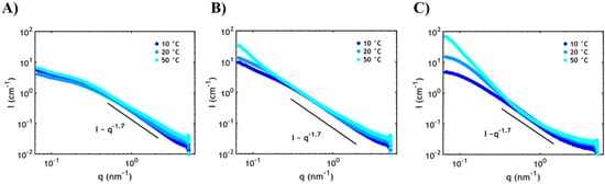 The high q region (0.5–2 nm−1) contains information about the average conformation of the single polymer chains. For all temperatures and systems the same profile is observed, suggesting a similar conformation of the individual chains, independent of temperature. More specifically, this scaling (I ≈ q−1.7) indicates that the polymer chains behave nearly as in a semidilute polyelectrolyte solution, attaining a self-avoiding random walk conformation [36]. In the low q region (0.06–0.5 nm−1), except for the sample without PNIPAM (Figure 7A), an upturn is detected at high temperatures. This upturn is mainly due to the decreased compatibility between PNIPAM and the complex phase leading to the segregation of PNIPAM into domains with dimensions of tens of nanometres (according to the observed q-range). The domain size distribution is likely to be broad since well-defined peaks related to the structure factor are not observed: this is mainly ascribed to the high polydispersity of the polymer chains (see Materials and Methods section). Furthermore, the upturn, at high PNIPAM content (Figure 7C), is detected already at temperatures below the LCST (around 23 °C according to the DSC data), which indicates that large fluctuation of PNIPAM concentration already starts at room temperature prior to dehydration.