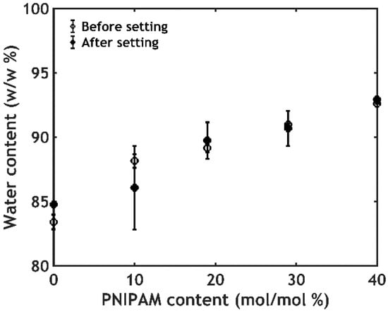 Water content as a function of PNIPAM content for the samples PxS0.75 before and after the temperature-activated setting process. Error bars represent standard deviations.
