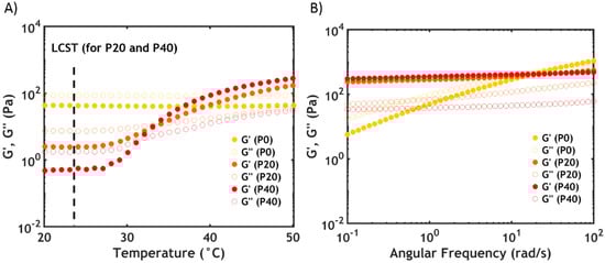 (A) Temperature sweeps and (B) frequency sweeps performed at 50 °C performed as a function of PNIPAM content for PxS0.75. Filled dots represent G’, while hollow dots represent G”.