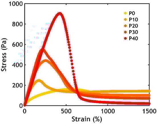 Almost all samples show a profile characteristic of fracture: the stress (σ) rises linearly as a function of strain (ε) until reaching a maximum. After that, the stress drops quickly, indicating failure of the physical network [42]. The sample without PNIPAM (P0S0.75) does not show a well-defined peak, with the stress increasing slowly as a function of strain, until reaching a steady-state value. This response is typically observed for a viscoelastic liquid, since the material does not fracture but simply flows as an effect of the applied deformation. The slope of the linear part and the area under the curve increase as a function of the PNIPAM content, meaning that the addition of thermoresponsive units not only stiffens the material, but also favours energy dissipation, improving the material properties both in linear and non-linear deformations.