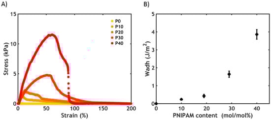 As evidenced in the linear rheology section, the moduli decrease as a function of PNIPAM content, i.e., the presence of the thermoresponsive chains swell and soften the material. However, when PNIPAM is absent (P0S0.75), the high bulk elastic energy stored in the material and weak interfacial interactions lead to detachment from the probe at lower strains than for softer and PNIPAM-containing polymers, as shown in the stress-strain curves (Figure 14A). The adhesive P0S0.75 fails without leaving any residues on the probe: this is known as an adhesive mode of failure. By increasing the PNIPAM content (P10S0.75), a shift from an adhesive to a cohesive mode of failure is observed, together with the formation of filaments able to hold some stress at high deformations. The adhesive fails at a much higher strain in this case and, thereby, the work of adhesion increases (Figure 14B). The presence of the PNIPAM chains, despite being inactive (below the LCST), is therefore crucial because it introduces an additional energy dissipation mechanism, which enables the relaxation of the polymer chains at high deformations [46]. Furthermore, PNIPAM may adsorb more strongly to the substrate, promoting a transition from an adhesive to a cohesive mode of failure. The highest work of adhesion (6.5 J/m2) is detected at a PNIPAM content of 30%. However, when the PNIPAM content is too high (P40S0.75), the material becomes too weak to resist fracture: consequently, the peak stress, as well as the work of adhesion, suddenly drops to much lower values, with the sample always failing cohesively.