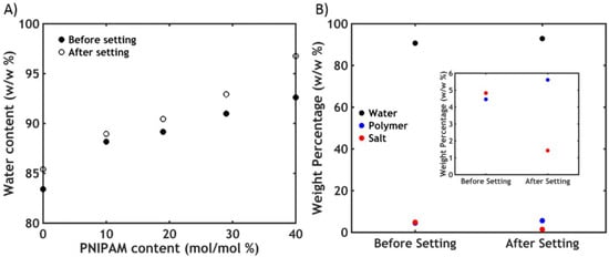 (A) Water content as a function of PNIPAM content for the samples PxS0.75 before and after the salt-activated setting process at T = 20 °C. (B) Water, polymer and salt content for the sample P30S0.75 before and after the setting process (a magnification of the lower part of the plot is reported in the inset).
