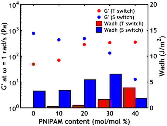 G’ at ω = 1 rad/s and Wadh obtained after a temperature and a salt switch plotted as function of PNIPAM content.
