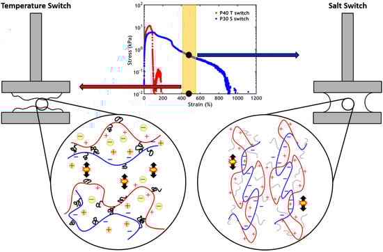 Based on these observations, the following analysis will now focus only on samples prepared at 0.75 M NaCl, a salt concentration below the CSC, yet high enough to render the material a low viscous fluid at room temperature (RT). The setting process is then activated using two different environmental triggers (Figure 5), which will be separately described in the following sections. When performing a temperature switch, the solidification of the material is obtained by raising the temperature above the LCST, stimulating the collapse and the aggregation of PNIPAM side chains (Figure 5A). When performing a salt switch, the reinforcement of the complex coacervate is obtained by lowering the ionic strength of the surrounding environment, leading to the formation of stronger electrostatic interactions between the polyelectrolyte backbones (Figure 5B).