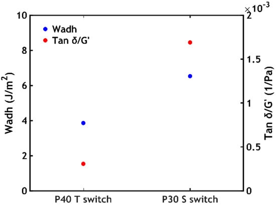 After the salt-triggered setting process, performed at 20 °C, the work of adhesion increases as a function of PNIPAM content up to a critical threshold (P30S0.75, Wadh = 6.5 J/m2), after which it drops to very low values for P40S0.75 (Figure 14).