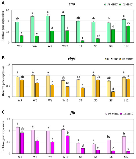 Transcriptional reprogramming of encoding laminin binding protein (eno) (A), elastin binding protein (ebps) (B) and fibrinogen binding protein (fib) (C) genes in MRSA strains treated with TC under biofilm growth condition. Gene expression data were normalized to the rpoB reference gene. Results are shown as n-fold changes (mean ± standard deviation (SD)) in the target gene expression compared to the control (biofilm untreated with TC). Significant differences in relative gene expression levels among examined MRSA samples were marked by different letters (a, b, c, d, e, f, ab, bc, ef) (Tukey’s test; p < 0.05). W: weak producer of biofilm; S: strong producer of biofilm; 3, 6, 8, 12: time of bacterial growth (h); MBIC: minimum biofilm inhibition concentration. Each assay was performed three times and the results were averaged.