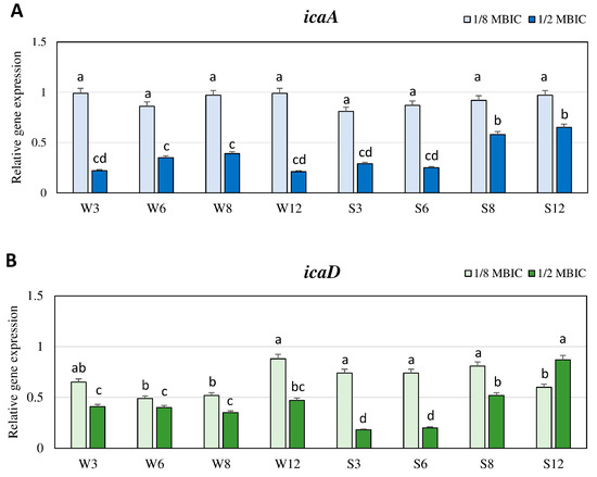 Whereas, in the case of the icaD gene, the expression level in the presence of TC at the concentration of 1/8 MBIC was lower than in the biofilm without TC. The lowest values were observed after 6 and 8 h in the weak biofilm and after 12 h in the strong biofilm (Figure 3B). In the presence of TC at the concentration of 1/2 MBIC, the expression level of icaA and icaD in the case of the weakly adhering strain was above twice lower than in biofilm without TC, and did not significantly differ in the subsequent time points (Figure 3A,B). In the case of the strongly adhering strain, inhibition of icaA and icaD expression by TC was highest after 3 and 6 h, and the values were lower (3.5 to 5.5-times) than in the untreated biofilm. After 8 and 12 h, expression levels of these genes significantly increased, but they were still lower than in biofilm without TC (Figure 3A,B).