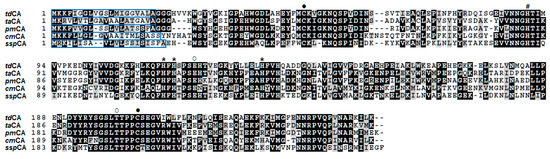 Multiple alignment of representative thermophilic α-CAs. The sequences are from T. dismutans (tdCA; OAQ21602), T. ammonificans (taCA; WP_013538320), P. marina (pmCA; ACO04804), C. mediatlanticus (cmCA; EDM23829), and S. yellowstonense (sspCA; ACD66216). Conserved or similar residues across three or more sequences are shaded in black or gray, respectively. The native signal sequences are enclosed in blue boxes. The two cysteine residues for the formation of the intramolecular disulfide bond are indicated by a closed circle (●). The three zinc ligand histidine residues (*) and proton shuttling histidine residue (#) are marked. The two gate-keeper residues are also indicated by an open circle (○).