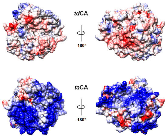 Electrostatic surface potential of CA. Electrostatic surface potentials of tdCA and taCA (protein data bank (PDB) ID: 4C3T) are represented on a scale from − 10 kT/e (red) to + 10 kT/e (blue). The predicted structure of tdCA was first visualized in an orientation showing the active-site cavity in the center of the structure, and the structure of taCA was then aligned according to the orientation of tdCA. Only one (chain A) of the two chains was taken for the visualization of taCA.