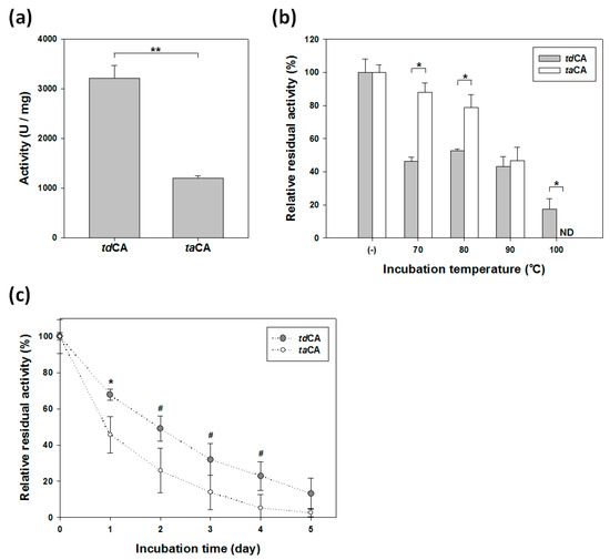 Next, the stability of the enzyme was evaluated by measuring the remaining enzyme activity after heat treatment under high-temperature conditions. The decrease in activity represents the fraction of enzyme inactivated due to the heating [31]. After short-term (15 min) incubation at high temperature ranging from 70 to 90 °C, tdCA showed similar residual activities (43–53% of its initial activity) regardless of the incubation temperature, while the residual activity of taCA gradually decreased from 88% (at 70 °C) to 47% (at 90 °C) (Figure 4b). At first glance, the stability of tdCA seemed to be lower than that of taCA because the residual activities of tdCA were generally lower than those of taCA (Figure 4b). For instance, the residual activity of tdCA after 15 min incubation at 70 °C was 46%, which was much lower than that (88%) of taCA. At 100 °C, however, tdCA exhibited 18% residual activity, while taCA completely lost its activity (Figure 4b). These results prompted us to hypothesize that the purified tdCA enzymes were composed of heat-labile and heat-stable fractions and the sharp decrease of tdCA in residual activity after the short-term incubation was due to the inactivation of the heat-labile fraction. The remaining heat-stable fraction was assumed to be more stable than taCA. To test this hypothesis, we first incubated the intact enzymes at 70 °C for 15 min, and then, the heat-treated enzymes were taken as the initial samples (0 days) for the subsequent long-term stability test (up to five days) at 70 °C. The result demonstrated that the preheated tdCA was actually more stable than taCA (Figure 4c). The inactivation showed monophasic, first-order kinetics in both tdCA and taCA (R2 > 0.99), implying that the active enzymes from the heat-treated initial sample were composed of a single, heat-stable fraction [32]. The calculated half-life of tdCA (42.2 h) at 70 °C was 83% longer than that of taCA (23.1 h). It is worth noting that the stability, as well as the solubility of taCA, could be improved by increasing the ionic strength with the addition of 300 mM NaCl [9,20] while the stability of tdCA was not affected by the addition of salt (data not shown). Collectively, these data show that tdCA can be a better catalyst than taCA in terms of both activity and stability under general low-salt-containing aqueous conditions.