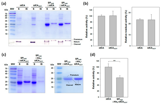 As previously shown, the expression level of tdCA was relatively low (Figure 2a), which necessitates further improvement of the expression level for the practical applications. In our efforts to improve the stability of tdCA by protein engineering, we incidentally found that the expression level of tdCA was significantly increased by the mutation S82Y (Figure 5a). The variant tdCAS82Y did not show any difference in both activity and stability compared to the wild-type tdCA (Figure 5b), implying that the mutation S82Y is neutral for the characteristics of tdCA. Next, we tried to express and translocate tdCA into the periplasm of E. coli via the Sec-dependent pathway, which is a better pathway than the Twin-arginine translocation pathway for CA secretion [33], by genetically fusing PelB signal peptide (SPPelB) to the N terminus of tdCA. This design was originally intended to construct a whole-cell biocatalyst with periplasmic tdCA (see below). The expression level of SPPelB::tdCA was remarkably improved compared to that of the wild-type, showing a thick band in the SDS-PAGE analysis (Figure 5a). Thus, the periplasmic expression may be used as an alternative strategy for improving the expression level of recombinant protein poorly expressed in the cytoplasm. When combined with the S82Y mutation, the total SPPelB::tdCAS82Y, including the insoluble premature form, showed higher expression level compared to that of SPPelB::tdCA, although the expression levels of mature forms were similar to each other (Figure 5a). It appeared that the excess amount of SPPelB::tdCAS82Y was accumulated as an aggregate in the cytoplasm without the cleavage of signal peptide due to the saturation of the Sec-translocon capacity [34]. Consequently, the expression level of mature form from SPPelB::tdCAS82Y increased 8.3-fold compared to that from wild-type tdCA according to the densitometric analysis on the Western blot result. This result can successfully lead to the reduction of the enzyme production cost.