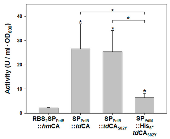 Whole-cell activities of recombinant strains with periplasmic CAs. Any enzymatic activity in the supernatant after centrifugation of the whole-cell solution was subtracted from the total activity to obtain pure whole-cell activity. Error bars represent standard deviations from three independent experiments. Asterisks indicate statistical significance determined by unpaired, two-tailed t-test (* p < 0.05). An asterisk right above a bar indicates statistical significance compared with RBS2SPPelB::hmCA sample.