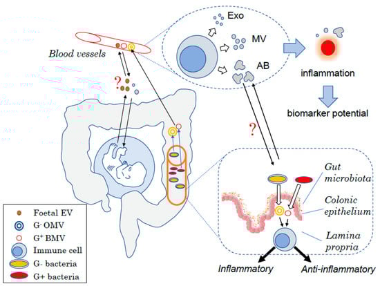 Schematic view of the different types of EVs in humans. EVs are produced at each body site such by mononuclear cells in the blood under the form of exosomes (Exo), microvesicles (MVs), or apoptotic bodies (AB) depending on their size. Changes in the amount of EVs produced have been linked to inflammatory diseases and thus could be used as biomarkers to diagnose diseases. EVs are also key for the host to communicate with endogenous yet “foreign” organisms. During embryonic development, the foetus produces EVs that can interact with cells from the mother and might interfere with maternal tolerance towards the haploidentical foetus. Similarly, the gut bacteria produce EVs that can modulate host–cell immune responses and more broadly the host health status. Bacterial EVs can have pro- or anti-inflammatory effects depending on the bacteria of origin. EVs may also be used for the host to communicate with these “foreign” organisms with maternal EVs that could potentially affect the foetus development as well as host EVs shown to modulate the bacteria composition.