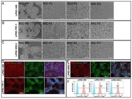 Neural differentiation of LiPSC lines one passage post thaw. (A–C) Morphology of LiPSC lines was changing during the differentiation from passage 0 (P0) to P3. (D–E) Immunofluorescent staining of neural stem cells (NSCs) at the end of P3 revealed that they express NSCs-specific markers (Nestin and Pax6). (F) Folw cytometry analysis at the end of P3 demonstrated high expression of Pax6 by cells acquired NSCs morphology. Scale bars, 100 µm.