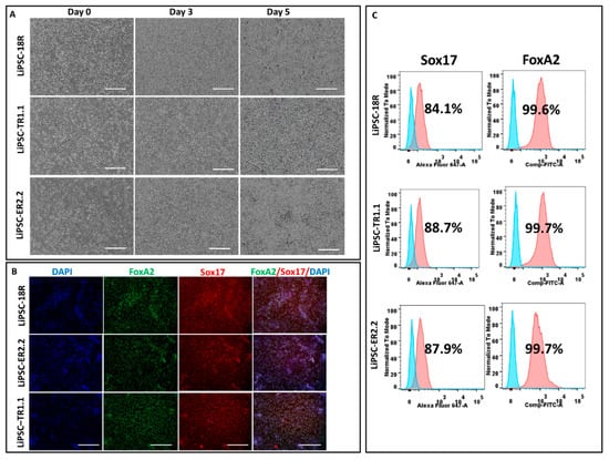iPSCs were differentiated to definitive endoderm (DE) lineage using a commercially available kit. Lower concentrations of Activin A induce mesodermal lineage differentiation [11], while a higher concentration at 100 ng/mL is generally used to induce iPSC differentiation to DE [12]. Activin A is produced by many cell types throughout development and is a member of the transforming growth factor beta (TGF-β) family of proteins. It has an important impact on the variety of cell functions including metabolism, apoptosis, and proliferation [13]. iPSCs’ morphology was changed until day 5 (Figure 3A). Immunofluorescent staining of endoderm markers (FoxA2 and Sox17) [14] was used to confirm the differentiation of iPSCs to DE for all three iPSC lines (Figure 3B). More than 80% of LiPSC-18R derived cells were positive for Sox17 and FoxA2 as specific markers for DE on day 5, as shown by flow cytometry analysis (Figure 3C).