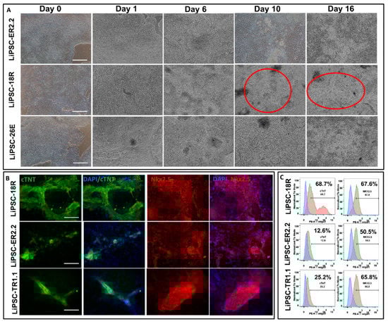Differentiation of three iPSC lines into cardiomyocytes (CMs) was performed over 14 days in 2D using established protocols [15]. During the differentiation state, the morphology of the cells rapidly changed during the Wnt pathway induction and inhibition (day 0–4) and continued until day 14 (Figure 4A). For LiPSC-18R and LiPSC-ER2.2 lines, the first cell beating appeared on day 7 or 8 post-induction. No beating patches were observed for LiPSC-TR1.1 during the differentiation. For liPSC-18R, the beating cells were initially confined to a small area, but expanded gradually to various sizes (ranging from 500 µm to a few millimeter) of synchronized beating areas, but for the LiPSC-ER2.2, there was only a limited number of beating areas and these areas were small (Figure 4A and Supplementary Videos S1 and S2). Immunofluorescent staining of the differentiated cells on day 14 showed expression of cardiomyocyte specific markers including cTnT and Nkx2.5 (Figure 4B). Flow cytometry analysis of the iPSC-derived CM further demonstrated cTnT and Nkx2.5 expression. The expression of Nkx2.5 on day 14 ranged between 12.6% (for LiPSC-ER2.2) and 68.7% (for LiPSC-18R). The expression of cTnT on day 14 post induction ranged between 50.5% (for LiPSC-ER2.2) and 67.7% (for LiPSC-18R). Viability of harvested cells on day 14 was more than 90% and each well of a six well plate generated around 2.5 × 106 viable cells for each line.