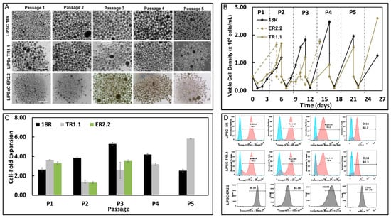 For most transplantation therapies requiring derivatives of human iPSCs, it is necessary to implement culture strategies that can be scaled-up efficiently. One method is the use of stirred-tank bioreactors, where the cells can be expanded and differentiated as free-floating aggregates in 3D. In this study, we evaluated the ability of the cryopreserved iPSCs lines to expand in this manner in 3D by demonstrating that the cells expanded over three (LiPSC ER2.2) and five (LiPSCTR1.1 and LiPSC-18R) passages in suspension culture (Figure 5A). Over each passage, cell-fold expansion of 2.0–5.9-fold was observed while maintaining their genomic stability and pluripotency (Figure 5B–D and Figure S5A). All three lines had variable fold expansion that might require optimization of the culture conditions—for example, culture medium and hydrodynamic environment. Three LiPSCs lines were induced to form embryoid bodies (EBs) post Biott expansion in order to show their potential of three-lineage differentiation. All three lines formed typical EB aggregates during the 10 days in suspension and developed cell outgrowth after plating on gelatin-coated plates (Figure S5B).