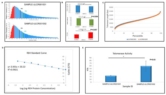 Telomerase relative activity was measured by quantitative telomeric repeat amplification protocol (Q-TRAP) (Life Length, Madrid, Spain). Briefly, protein extracts were prepared by lysing the cell pellets and quantifying the protein concentration form the resulting lysates. Telomerase protein extracts were then incubated with a specific oligonucleotide substrate to allow the enzymatic addition of telomeric DNA repeats by the endogenous telomerase. Following the enzymatic reaction, telomerase extension products were amplified and quantified by real-time quantitative PCR (qPCR). In real time PCR, a positive reaction was detected by accumulation of a fluorescent signal. The Ct (cycle threshold) was defined as the number of cycles required for fluorescence to cross the threshold (i.e., exceeds background levels). The telomerase-positive standard dilution series was plotted against the telomere protein concentration (r2 > 0.9) as a standard curve of Ct values. The assay was performed in triplicate. The mean and standard deviation (SD) from each triplicate was calculated, which include both positive and negative controls. Data were reported as RTA (relative telomerase activity).