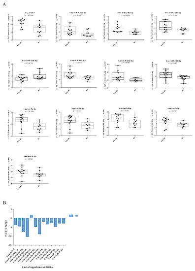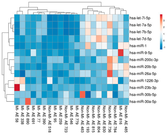 Of 74 profiled miRNAs, 13 were found to be significantly differentially expressed (Figure 1). All differentially expressed miRNAs except hsa-miR-23b-3p were downregulated in the MI group compared to the non-MI group.