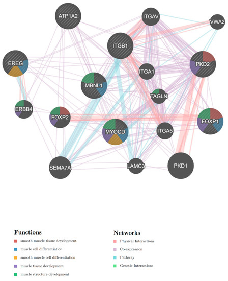 Network analysis of the seven selected genes was visualized using the GeneMANIA [15] plugin for Cytoscape [16] software (Figure 3). In the network analysis, EREG, FOXP1, MBNL1, and MYOCD were related to muscle cell differentiation, FOXP1 and PKD2 were related to SM tissue development, and EREG and MYOCD were related to smooth muscle cell (SMC) differentiation.