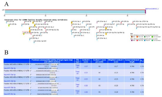 An independent bioinformatics tool, TargetScan 7.1 (http://www.targetscan.org/vert_71/) [17], was used to predict miRNA targets and found that MBNL1 contained potential sites for hsa-miR-30b-5p. The results of this analysis (Figure 4) showed that MBNL1 has potential recognition sites for 7-mer-A1 seed sequences of hsa-miR-30b-5p with a context++ score of 85, suggesting that hsa-miR-30b-5p is the most representative miRNA that strongly regulates the expression of MBNL1.
