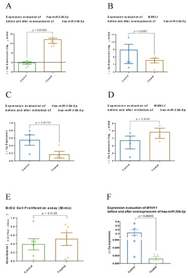 To confirm the predicted regulatory role of hsa-miR-30b-5p on MBNL1, we used commercially available human VSMC culture. The hsa-miR-30b-5p gain-of-function (mimic) and loss-of-function (inhibition) study was conducted using a transfection protocol (with at least three biological and three technical replicates). The levels of hsa-miR-30b-5p and MBNL1 were quantitated by RT-qPCR. Statistical analysis was performed using non-parametric Mann–Whitney U test. The RNA expression results are displayed as relative expression values (Figure 5). In the hsa-miR-30b-5p mimic experiment, we were able to reach significant overexpression of hsa-miR-30b-5p with p = 0.043 (Figure 5A). After 24 h of overexpressed hsa-miR-30b-5p in the same VSMC culture, we evaluated MBNL1 expression level and found it to be significantly downregulated with p = 0.028 (Figure 5B). In the loss of hsa-miR-30b-5p function experiment, we inhibited the level of hsa-miR-30b-5p (Figure 5C). Corresponding assessment of MBNL1 in the same VSMC culture revealed upregulation of MBNL1 expression; however, the trend did not reach significance level. Assessed MYH11, as common marker of VSMC differentiation, revealed a non-significant drop after 24 h of overexpressed hsa-miR-30b-5p (Figure 5F).