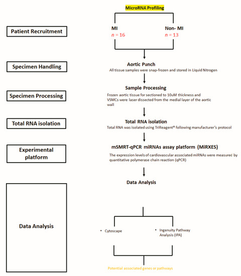 Perioperative aortic punch samples from participating patients underwent LCM for the isolation of VSMCs. Total RNA was extracted from LCM tissue. The miRNA profile was evaluated using the mSMRT-qPCR miRNA assay platform (MiRXES, Singapore). miRNA profiling was performed using RT-qPCR. A schematic diagram of the project’s workflow is presented in Figure 6.