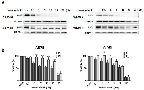 Two human melanoma cell lines, derived from a primary amelanotic tumor —A375, and from metastasis to lymph nodes —WM9, were positively verified for the presence of BRAF V600E mutation. To check their sensitivity to vemurafenib, a selective inhibitor of mutated BRAF, Western Blot analysis and a cytotoxicity assay were performed. The obtained results show that the A375 cell line is more responsive to vemurafenib treatment compared to WM9, both in terms of the inhibition of phosphorylation of ERK kinase, which is a direct downstream effector of BRAF, and a decrease in viability (Figure 1A,B). Following the characterization of parental lines (PL), we started the establishment of cell lines resistant (RL) to vemurafenib. To achieve this goal, we cultured A375 and WM9 cells in the presence of increasing concentrations of BRAF V600E inhibitor, starting from 0.05 µM and doubling the amount of drug every two weeks. To verify if the cells had acquired resistance to vemurafenib, we conducted experiments analogous to the ones performed on parental cell lines. The collected results show that both cell lines exhibit resistance even to high concentrations of the used drug, seen as a prevalence of ERK phosphorylation and an increased cell viability (Figure 1A,B). A375 RL seems to demonstrate a higher level of resistance in terms of vemurafenib-mediated cytotoxicity, which can be also noticed in IC50 values for vemurafenib: 39.378 for the resistant line vs. 13.217 µM for the parental line (Figure S1). In the case of WM9 cells, these values were similar for both cell lines (ca. 20 µM).