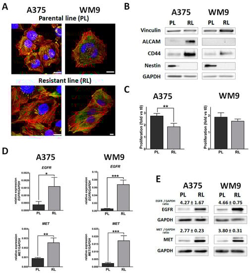 Due to the fact that cancer cells resistant to treatment often display overexpression of growth factor receptors, we checked the level of EGFR and MET in generated cell lines. We observed that both A375 RL and WM9 RL are discerned by a significant increase in the expression of EGFR and MET on mRNA and in the protein level (Figure 2D and E). A375 RL experienced a two- to fourfold increase in both receptors’ level, while for WM9 RL the change factor was even greater.