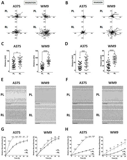First, we tracked the spontaneous movement of the cells, using the IncuCyte Live-Cell Imaging System, and ImageJ software with the Manual Cell Tracking plugin. Based on the generated spider graphs and quantified distances covered by cells, we observed that resistant cell lines exhibited an increased rate of spontaneous migration (Figure 3A,C) and invasion (Figure 3B,D). In the case of A375 RL, this occurrence was more pronounced for cells embedded in the ECM, while WM9 RL exhibited double the rate of the parental line’s migration and invasion. Next, we performed wound healing analysis. Again, we noticed that cells resistant to vemurafenib migrated (Figure 3E,G) and invaded (Figure 3F,H) much faster compared to parental lines. During this assay, A375 RL showed the greatest increase in the rate of migration and invasion, as resistant cells in standard 2D conditions required only 6–8 h to completely cover the wound, while the parental cells were not able to realize this goal even after 24 h. Moreover, the elevated motile abilities of WM9 RL were more noticeable in the case of the invasion test.