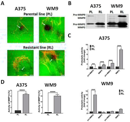 Based on the previous results showing that resistant cells are characterized by an elevated rate of invasion, we verified whether they also exhibited increased proteolytic activity. First, to evaluate the pattern of digestion, we seeded the cells on cover slips coated with fluorescently-labeled gelatin (Figure 4A). The dark spots on the green background indicate the places of digestion by gelatinases. While A375 and WM9 parental lines showed sphere-like digestion patterns, in the case of resistant cells, separated dark spots (WM9 RL) or barely visible digestion along the edges of the cell (A375 RL) could be detected (Figure 4A). In the next step, we conducted a gelatin zymography assay using concentrated cell-conditioned media to establish which secreted gelatinases are more active in resistant cells (Figure 4B,C). While both resistant cell lines demonstrated an elevated level of pro- and active MMP2, in the case of WM9 RL, albeit not in statistically significant way, they differed regarding MMP9. Whereas the WM9 RL displayed a massive increase in pro-MMP9 rate with slight downregulation of active MMP9, an increase in the active MMP9 level with a simultaneous decreasing tendency of the pro-MMP9 rate was observed in the case of the A375 resistant cell line, which could be a result of MMPs’ compensation. However, it should be noted that the elevated level of MMP9 in A375 RL is not clearly seen on the zymography gel, while the densitometry followed by statistical analysis indicates significant upregulation of this metalloprotease.
