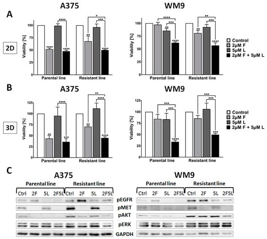 As we have previously shown, EGFR and MET seem to be promising targets for anti-melanoma combination therapy using small molecule inhibitors. Foretinib (F, MET inhibitor) and lapatinib (L, EGFR inhibitor) used simultaneously were able to synergistically decrease the viability of melanoma cells, and also significantly diminish the invasive abilities and proteolytic activity of these cells [10,11]. Here, we have demonstrated that resistant cells exhibit overexpression of both studied receptors, which also corresponds to the elevated rate of migration and invasion. For this reason, we verified the sensitivity of established cell lines resistant to vemurafenib treatment, for inhibitors of EGFR (5 µM lapatinib) and MET (2 µM foretinib) used independently, and as a pair. First, we examined viability in 2D and 3D conditions, and we noticed that parental and resistant cells responded to the inhibitors’ treatment almost to the same extent in both setups (Figure 5A,B). Similarly to their respective parental lines, WM9 RL showed a significant decrease only after incubation with the pair of inhibitors, while A375 RL reacted to the pair of inhibitors and also to foretinib alone, albeit to a lesser extent. Considering that proliferation and protection against apoptosis are governed by signaling pathways such as MAPK and PI3K/AKT, which include constitutively active BRAF V600E, we looked into the activation status of its up- and downstream effectors. We performed Western Blot analysis using cell lysates collected after 4 h of cell incubation in the presence of EGF and HGF, ligands of EGFR and MET, respectively, and inhibitors of these RTKs (Figure 5C). Firstly, we noticed that both resistant cell lines exhibited hyperativation of EGFR, MET, and AKT, while phosphorylation of ERK was only slightly affected. A combination of foretinib and lapatinib treatment was sufficient to completely eliminate the activation of upregulated MET and EGFR in A375 RL, and even noticeably or slightly reduce the phosphorylation of AKT and ERK, respectively, compared to monotherapy. WM9 RL displayed slightly diminished sensitivity to drug treatment; however, only a pair of inhibitors was able to elicit decreased activation of AKT.