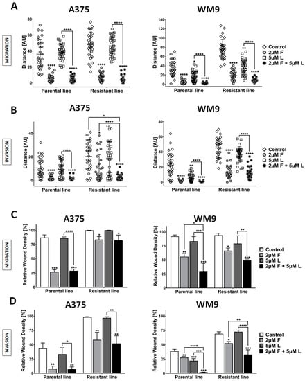 Cancer cells resistant to drug treatment often demonstrate increased invasive abilities [13,14,15]. To evaluate the motility of resistant cells, we employed two assays: a spontaneous migration/invasion test, where there is no chemoattractant or directionality during cells’ movement; and a scratch wound assay, where cells move to close the wound formed on a confluent cell layer. In order to mimic the physiological niche of the melanoma cells, we used Matrigel, a mixture of extracellular matrix (ECM) proteins that imitates the composition of the basement membrane, on which the melanocytes and primary melanoma cells reside in vivo. For migration tests (standard 2D), we seeded cells to wells coated with Matrigel. To generate the conditions in which invasion tests were performed, we covered the cells seeded on the Matrigel coating with an additional ECM layer.