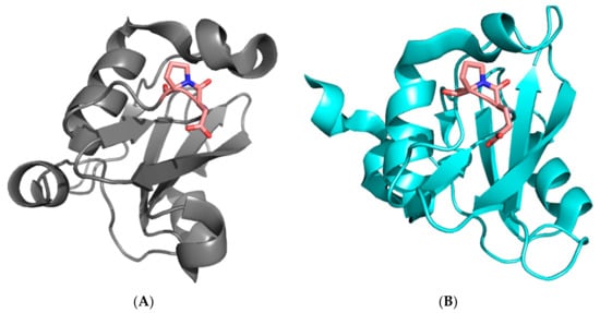 Three-dimensional structure of the N-SH2 (A) and C-SH2 (B) domains of the subunit p85 of PI3K. The residues D73–P74 of the N-SH2 domain and E683–P684 of the C-SH2 with the peptide bond in a cis conformation, located in a loop between the βE and βF strands, are highlighted in sticks.