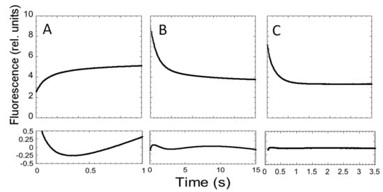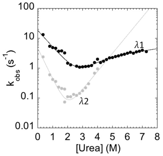 In general, the presence of multiphasic kinetics may either arise from the accumulation of a transient intermediate or from a structural heterogeneity of the ground state(s) [29,30,31,32,33,34,35,36,37,38]. In the case of C-SH2, it is interesting to observe that a clear biphasic behavior can be observed up to 4 M (urea), both in the refolding and in the unfolding arms. A quantitative analysis of the observed dependence of λ2 returns an apparent midpoint of this phase at a urea concentration of 2.5 M. Therefore, accumulation of the intermediate in unfolding experiments at urea concentrations higher than 3 M should be negligible and unfolding should thus conform to a single exponential. On the basis of these observations, it would appear that multiphasic unfolding should arise, at least in part, from a structural heterogeneity of the native state.