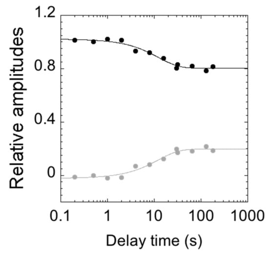 Relative amplitudes of the observed rate constants calculated from double mixing refolding experiments at different delay times between the first and second mix (in logarithmic scale). The relative amplitudes of the slow unfolding phase are represented in gray, and those of the fast phase in black. At short delay times, unfolding consists of a single exponential behaviour (with amplitudes approaching 0). Upon increasing the delay time between the first and second mix, the unfolding becomes consistent with a double exponential behaviour (the amplitudes of the slow phase increase).