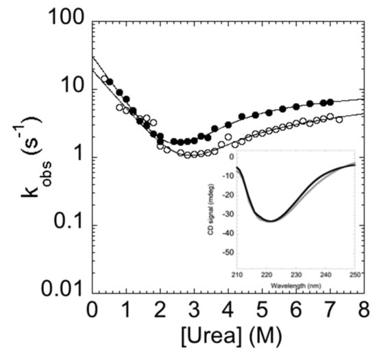 Chevron plot of the double mutant C-SH2 P684A (black circles) compared with the fast phase of the C-SH2 (empty circles). Upon the substitution of the proline with alanine, the slow phase is no longer present and the chevron plot resembles the fast phase observed for the C-SH2. Inset panel. Comparison of the far UV circular dichroism (CD) spectra of C-SH2 P684A (black) and C-SH2 (gray). It is evident that the mutation results in a marginal change in the secondary structure of the domain.