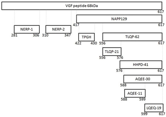 Different populations of endocrine cells in the adenohypophysis, adrenal medulla, gastrointestinal tract, and pancreas express VGF [9,10,11,12,13]. The studies on VGF regulation and distribution suggest that this molecule plays an important role in the developing and/or adult nervous and neuroendocrine systems, on feeding and energy expenditure, locomotor activity, sympathetic nerve activity, gastrointestinal motility and/or secretion, and pancreatic hormone secretion. An involvement in the regulation of reproduction and fertility is also likely, in view of the its pituitary localization and modulation with the estrous cycle [11,12]. The precursor VGF protein is composed by 615 (human) and 617 (rat, mice) amino acids [14]. One of the feature of the VGF protein structure is the presence of specific sequences rich in basic amino acid residues that represent potential cleavage sites for protein convertases of the kexin/subtilisin-like serine proteinase family, a class of enzymes that activate other proteins. Upon VGF cleavage by prohormone convertase (PC) 1/3 and PC2, a variety of bioactive peptides of low molecular weight are generated [13]; they are stored in dense core secretory vesicles and secreted upon stimuli [15]. More than 10 different VGF-derived peptides were detected in rat brain, bovine pituitary and human cerebrospinal fluid (CSF) [16,17,18]. Among them, those endowed with specific neuronal activities are: (i) neuroendocrine regulatory peptides-1 and -2 (NERP-1 and NERP-2); (ii) NAPP-129, also called VGF 20, based on its molecular weight (20 kDa); (iii) TLQP-62 (also known as VGF 10, 10 kDa) and TLQP-21; (iv) HHPD-41; (v) AQEE-30 (or Peptide V) and AQEE-11; vi) and LQEQ-19. Figure 1 summarizes the schematic representation of VGF-derived peptides and Table 1 indicates their activities.