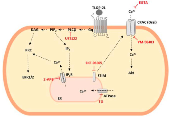 Schematic representation of TLQP-21 intracellular transduction mechanism in Chinese Hamster Ovary (CHO-K1) cells. TLQP-21, by binding a G protein coupled receptor (GPCR), activates Phospholipase C (PLC)-β that in turn produces Diacylglycerol (DAG) and Inositol Trisphosphate (IP3) as second messengers. These molecules activate Protein kinase C (PKC), stimulate extracellular signal-regulated kinase (ERK)1/2 phosphorylation and induce intracellular Ca2+ release from the endoplasmic reticulum (ER) with the subsequent Ca2+ entry from outside the cell, mediated by the stromal interaction molecules (STIM) and calcium release-activated calcium channel (CRAC)-Orai1 interaction. Phosphorylation of AKT is probably a result of the increase in cellular Ca2+ concentrations.