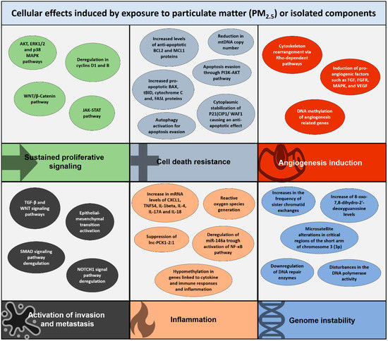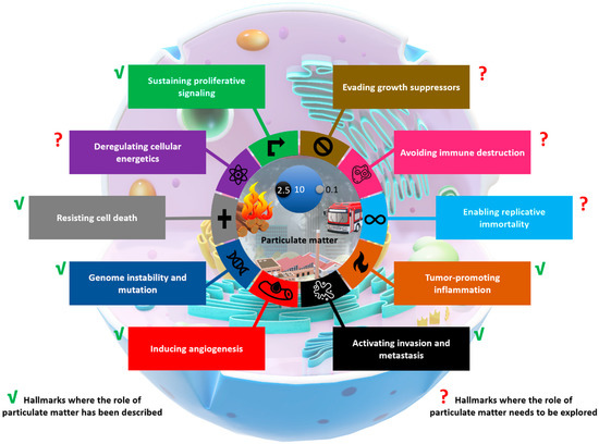 Particulate matter (PM) with an aerodynamic diameter less than 2.5 micrometers (PM2.5) or some of its components, such as polycyclic aromatic hydrocarbons (PAHs), have an impact on cell signaling pathways or cellular deregulations considered as key events during tumor development and known as hallmarks of cancer. However, some of these hallmarks are still negative for PM2.5 exposure, including induction of mutations, replicative immortality acquisition, and immune cell destruction.