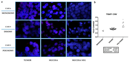 Figure 1. Tumor Necrosis Factor Receptor-Associated Protein 1 (TRAP1) copy number variation in human colorectal carcinomas. (a) Fluorescent in situ hybridization (FISH) assessment of TRAP1 copy number variation in three representative cases of human colorectal carcinoma and the corresponding non-infiltrated mucosa (magnification, 100×). Positive signals of hybridizations are shown in red, nuclei are counterstained with DAPI (Blue). Mucosa lacking TRAP1 probe (MUCOSA NEG) is reported as a negative control. (b) Frequency of TRAP1 copy number variation evaluated by RT-PCR in 58 human colorectal carcinomas.