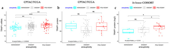 Interestingly, a progressive increase in TRAP1 mRNA levels from monosomic to disomic and polysomic tumors was observed (Kruskal–Wallis, p = 0.00046; Figure 2a). Consistently, human CRCs with TRAP1 polysomy were characterized by borderline statistically significant higher protein levels compared to disomic tumors (p = 0.053; Figure 2b). No meaningful conclusions can be drawn for monosomic cancers since only two cases with proteomic data are available in CPTAC/TCGA database (Figure 2b). Noteworthy, TRAP1 immunoblot analysis of the cohort of 58 human CRCs showed that tumors with TRAP1 polysomy are characterized by significantly higher levels of TRAP1 protein compared to disomic or monosomic tumors (Kruskal–Wallis, p = 0.0018; Figure 2c and Table S1). No statistical difference was observed between CRCs with TRAP1 monosomy and disomy (Figure 2c and Table S1).