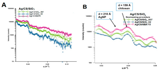 where q = were calculated for two peaks on the SAXS curves in the position of q = 0.0298 Å−1 and q = 0.0393 Å−1 (Figure 3B). The size of the electron density inhomogeneity d generated by AgNP is noticeable and equals around 210 Å. This may suggest that the size of the silver nanoparticle layer is below 20 nm. After dimensioning the metallic phase by other techniques, this result is fully justified. The calculation performed for the second peak (q = 0.0393 Å−1) suggests the presence of an explicit area of inhomogeneity d with a size around 16 nm. This observation was clarified by analyzing the SAXS curves for composites without a silver phase (Figure 4). In this case, the experimental curves revealed the presence of only one peak at the position of 0.0394 Å. The calculated d value was very similar (second peak for Ag/CS/silica composites) and almost equaled 16 nm (Figure 4B).