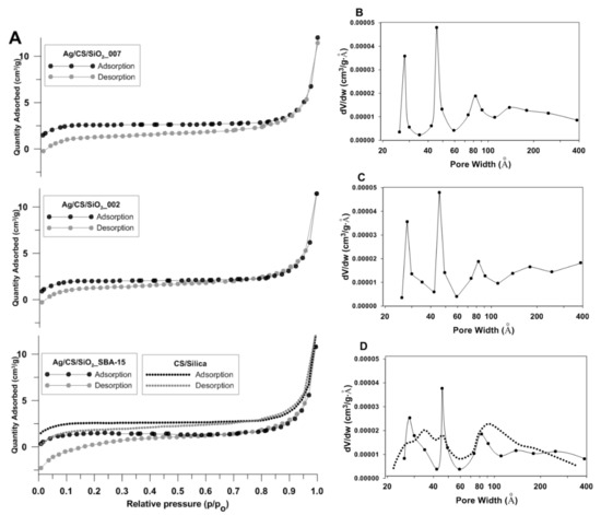 The porous structure of the investigated samples was determined using N2 adsorption–desorption analysis at 77 K. The experimental N2 gas adsorption-desorption isotherms for the investigated systems, as well as the pore size distributions (PSD) from the desorption data, are presented in Figure 5. Overall, the experimental isotherms are similar in shape for all the investigated samples. The specific surface area of the Ag/CS/silica nanofibers was evaluated at about 8 m2/g. The exact values are given in Table 1. In addition to the specific surface area (SBET), Table 1 contains also the values for the total pore volume and pore size distributions as the three most important maxima of the size distribution function PSD (Figure 5B–D). The specific surface area of the CS/silica (CS/SBA-15) nanofibers was also comparable (9.82 m2/g). The experimental isotherms of the investigated materials show typical adsorption behaviors for the IV type, according to the IUPAC classification.