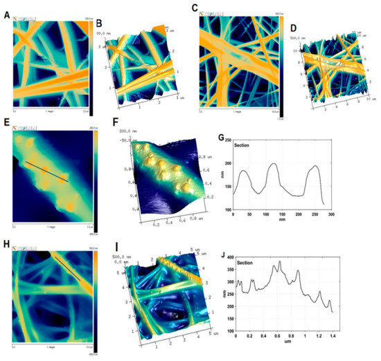 Atomic force microscopy (AFM) topography of the investigated nanofibers. AFM images 3 × 3 µm (A) and 10 × 10 µm (C) representing the topography of the CS/silica composite and 3D AFM images for these magnifications, respectively (B,D). AFM images 1 × 1 µm (E) and 10 × 10 µm (H) of Ag/CS/SBA-15, 3D visualization for these magnifications, respectively (F,I) and cross-sectional analyses of AFM images (G,J) according to the lines marked on images (E,H).