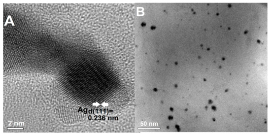 A highly crystalline quality of AgNP on chitosan nanofibers was achieved after their deposition. The morphology and crystallinity of AgNP extracted from composites were evaluated by TEM. Figure 8, which shows the obtained images as a high-resolution image (Figure 8A), illustrates a single AgNP and the general morphology of the extracted nanoparticles at a lower magnification (Figure 8B). Most particles were separated and were nearly spherical, with diameters ranging from 5 to 25 nm. The lattice fringes in the HRTEM image are d = 0.236 nm, which agrees with the first (111) lattice spacing of the fcc Ag phase.