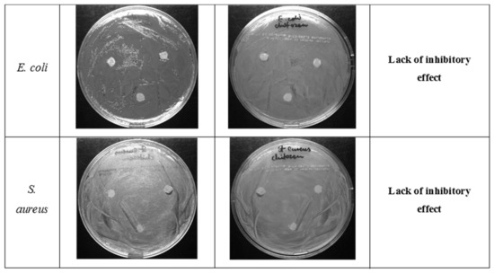 The antibacterial properties of CS/silica (CS/SBA-15), Ag/CS/SBA-15 membranes, and the AgNP solution were determined for E. coli ATCC25922 and S. aureus ATCC25923 by diffusion tests after a 24 h incubation. In the first stage, the biostatic activity was determined for composites without nano-molecular silver. Neither strain showed a significant zone of inhibited growth around CS/silica (Figure 9). The composites with embedded silver nanoparticles gave quite different results, as clear biostatic activity was observed. The Ag/CS/SBA-15 membrane showed a 10 mm inhibition zone for the E. coli ATCC25922 strain and an even larger (13–14 mm) inhibition zone for the S. aureus ATCC25923 strain, indicating a slightly higher activity against S. aureus.