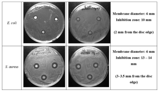 The images in Figure 10 show that the inhibition zone around the discs was two-fold larger for the S. aureus ATCC25923 strain than for the E. coli ATCC 25922 strain. This observation suggests a difference in the antibacterial properties of AgNP on chitosan nanofibers against biofilms formed by Gram-positive and Gram-negative bacteria. A similar effect was observed previously in the literature [57].