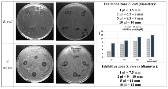 The concentration dependence of the antibacterial activity of the AgNP solution was confirmed by comparison studies. The dimensions of the inhibition zones of an AgNP solution (1, 2, 5, and 10 µL) dropped onto the agar medium on which the bacteria were spread, are shown in the images and graph depicted in Figure 11. These results confirmed that AgNP in suspension inhibited the growth of bacteria in a dose-dependent manner. The antimicrobial activity increased with the volume of solution used for both the Gram-positive (S. aureus ATCC25923), and the Gram-negative (E. coli ATCC25922) bacteria biofilms. However, again, a slightly higher antibacterial activity was observed against the S. aureus than against the E. coli.