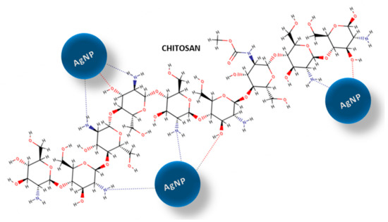 Schematic diagram of showing interaction of chitosan matrix with silver nanoparticles (AgNPs). The amine and hydroxyl groups in chitosan structure are responsible for possible interaction and stabilization of metallic phase.